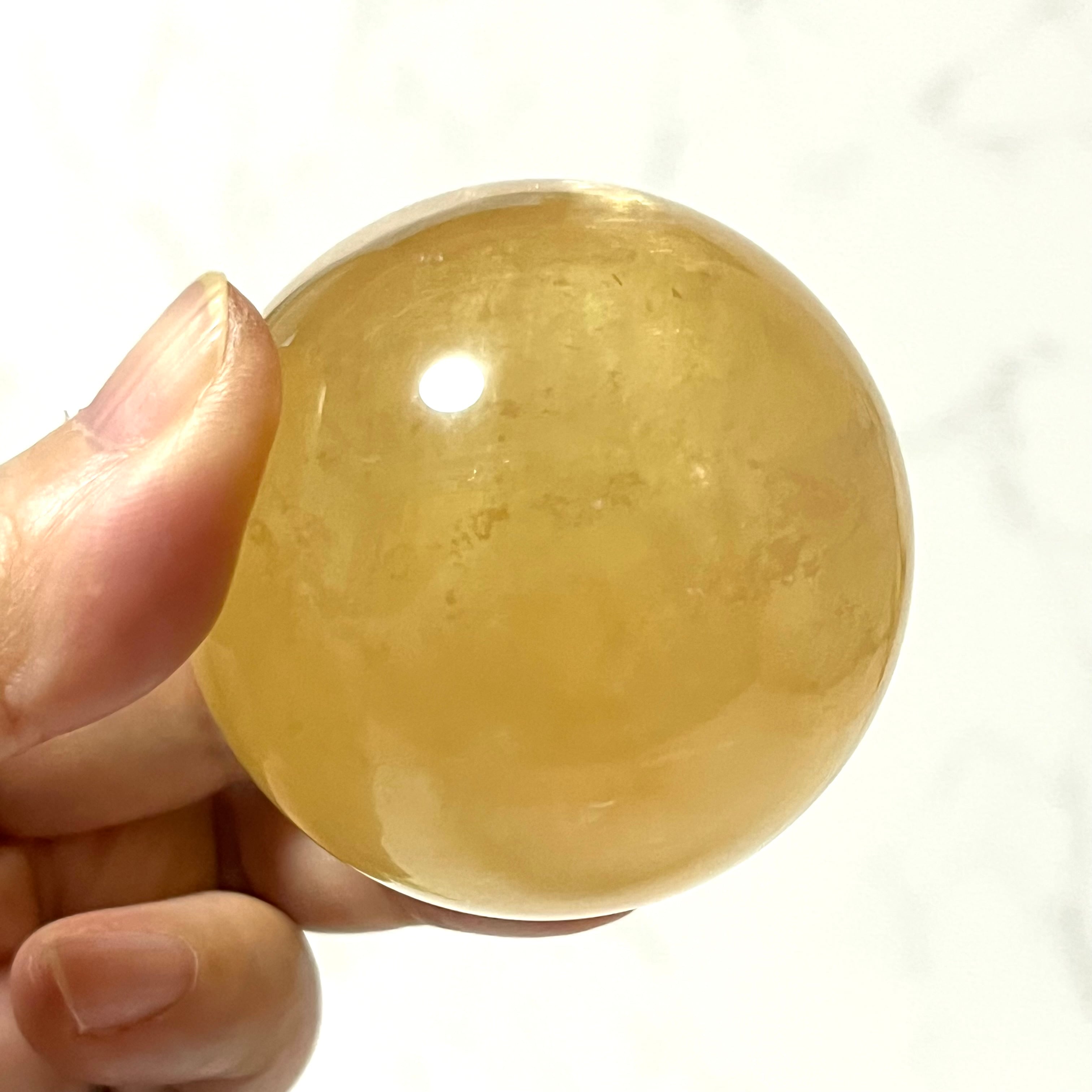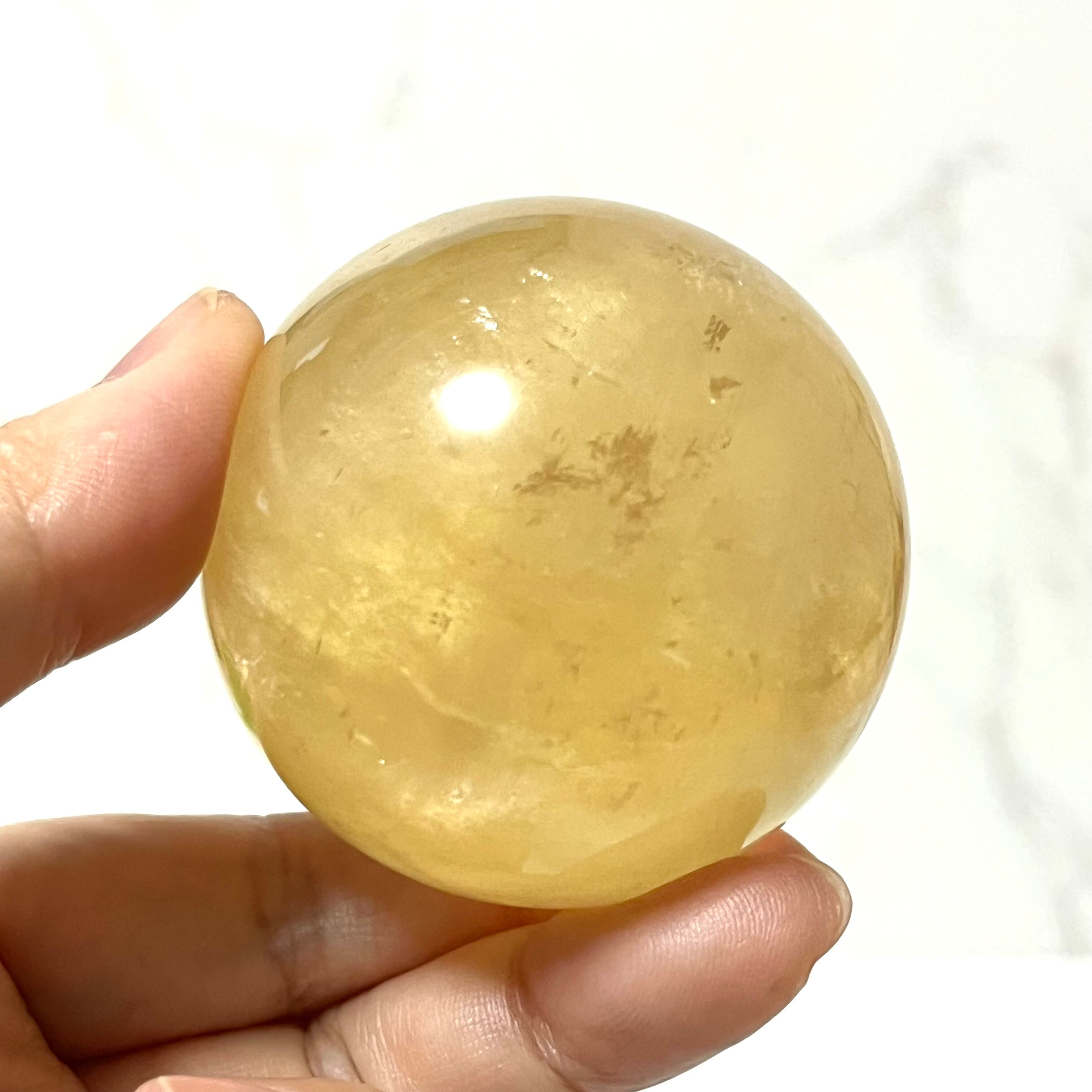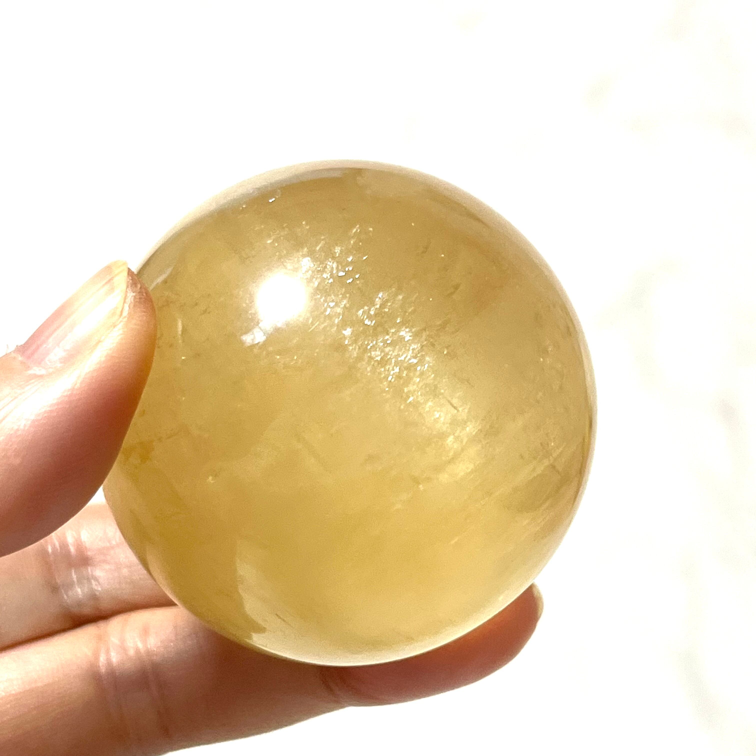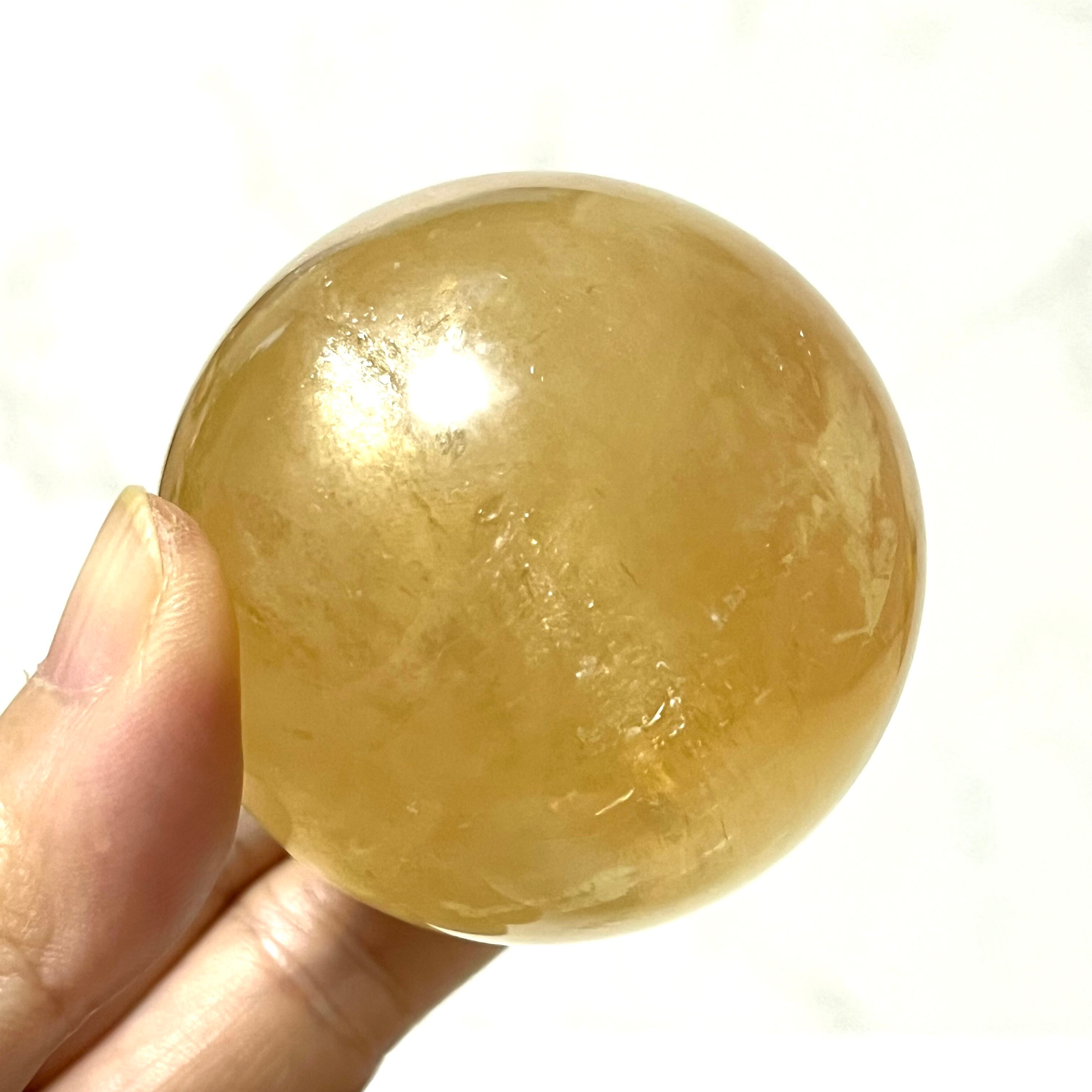 濃いめの美しいシャンパンゴールドカラーのゴールデンカルサイトのスフィア(丸玉)です。
