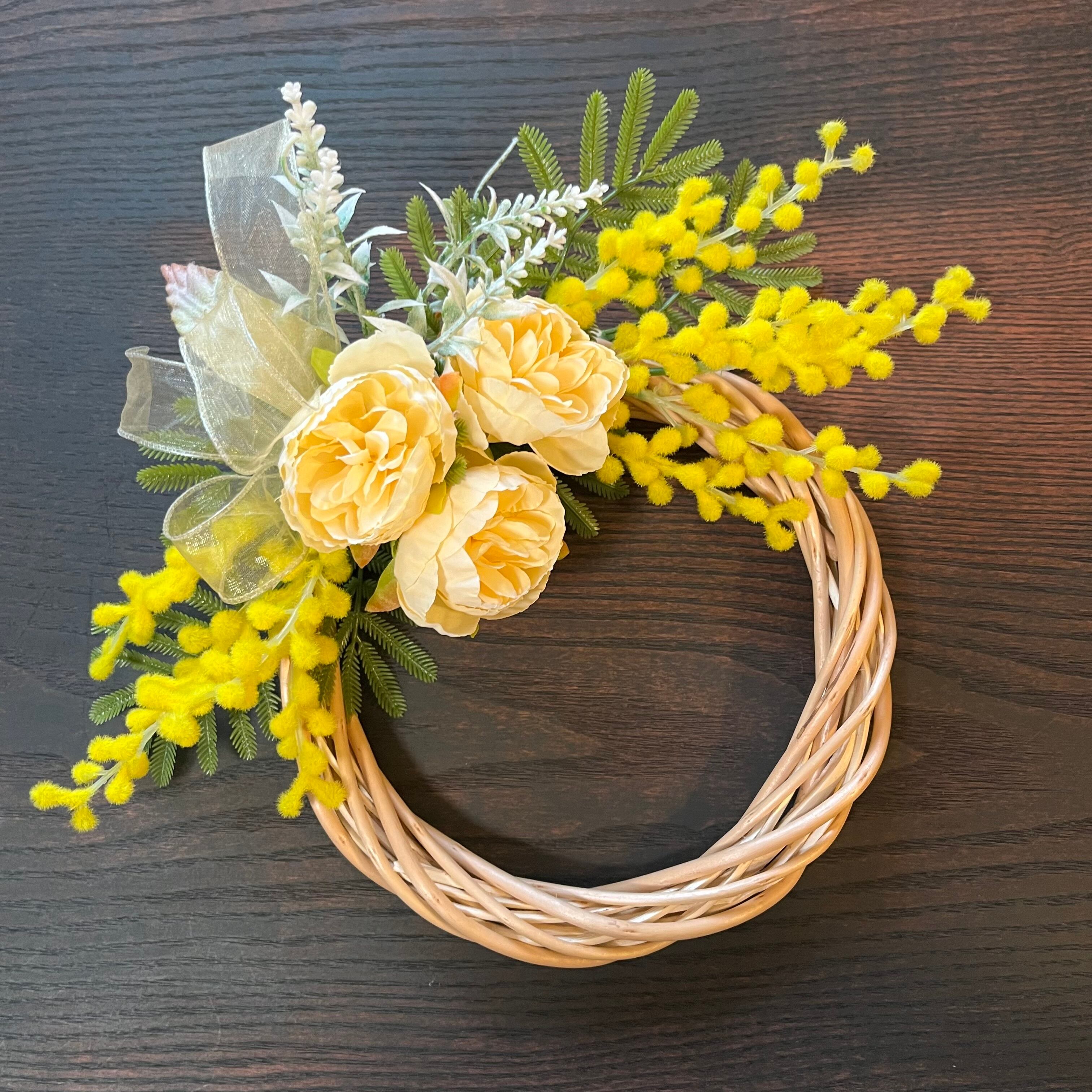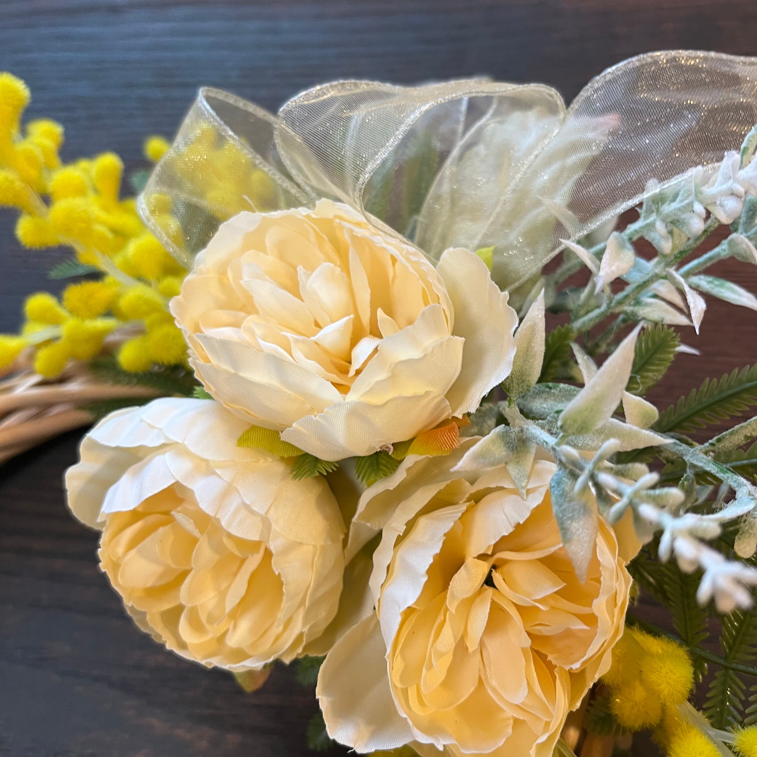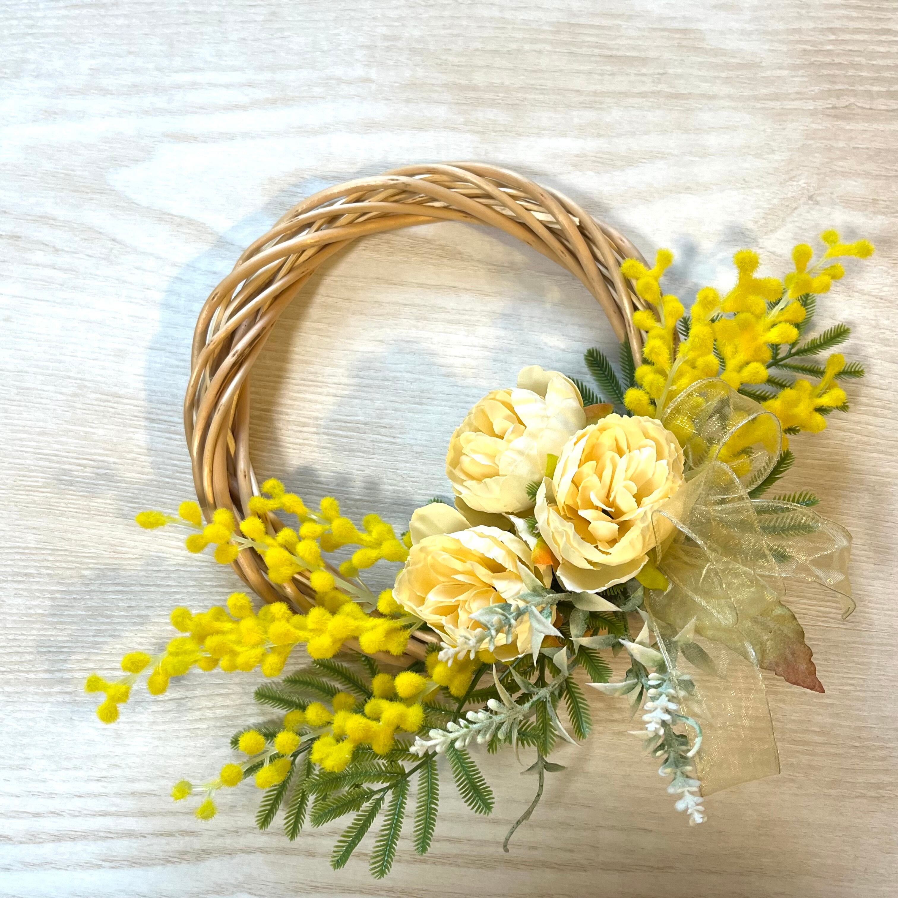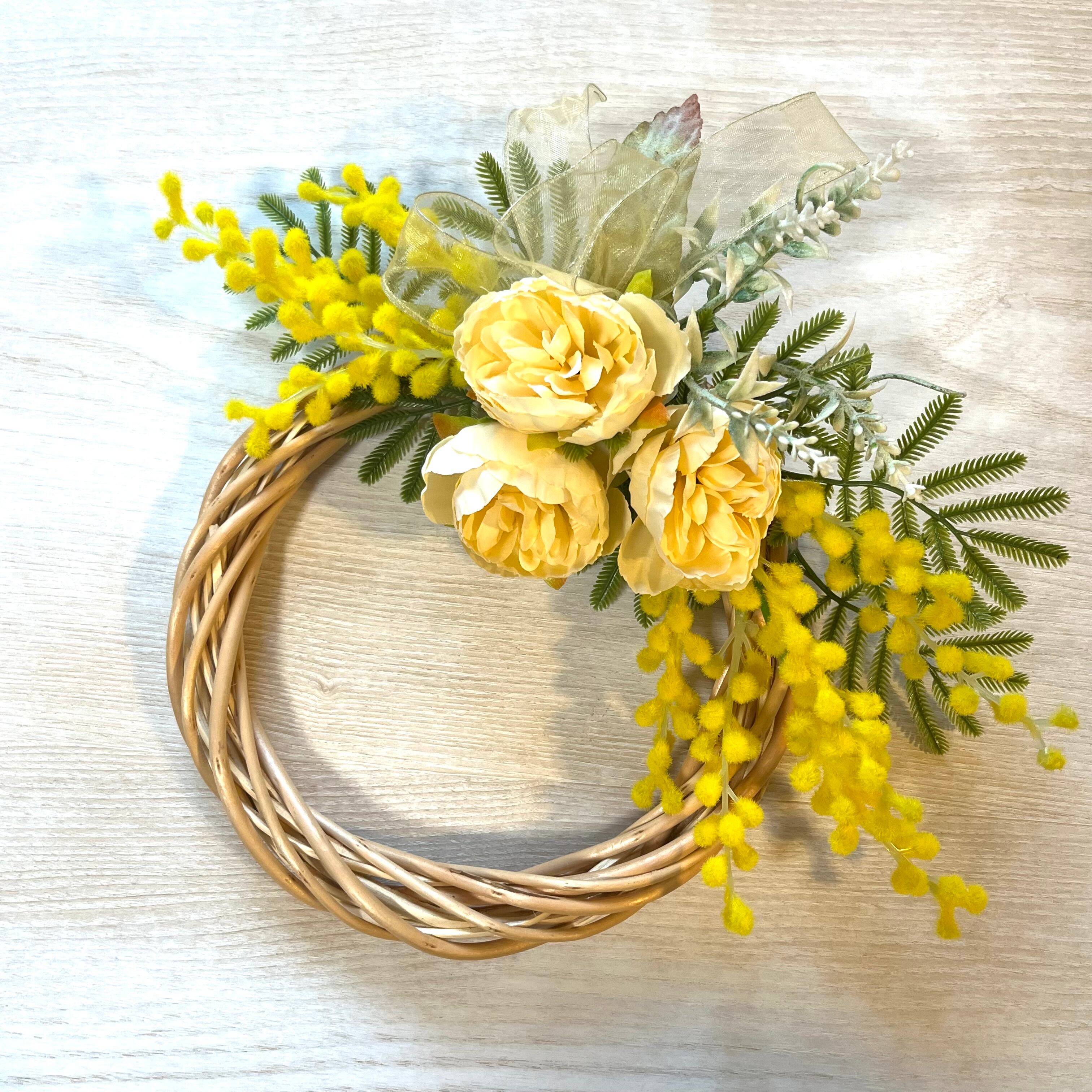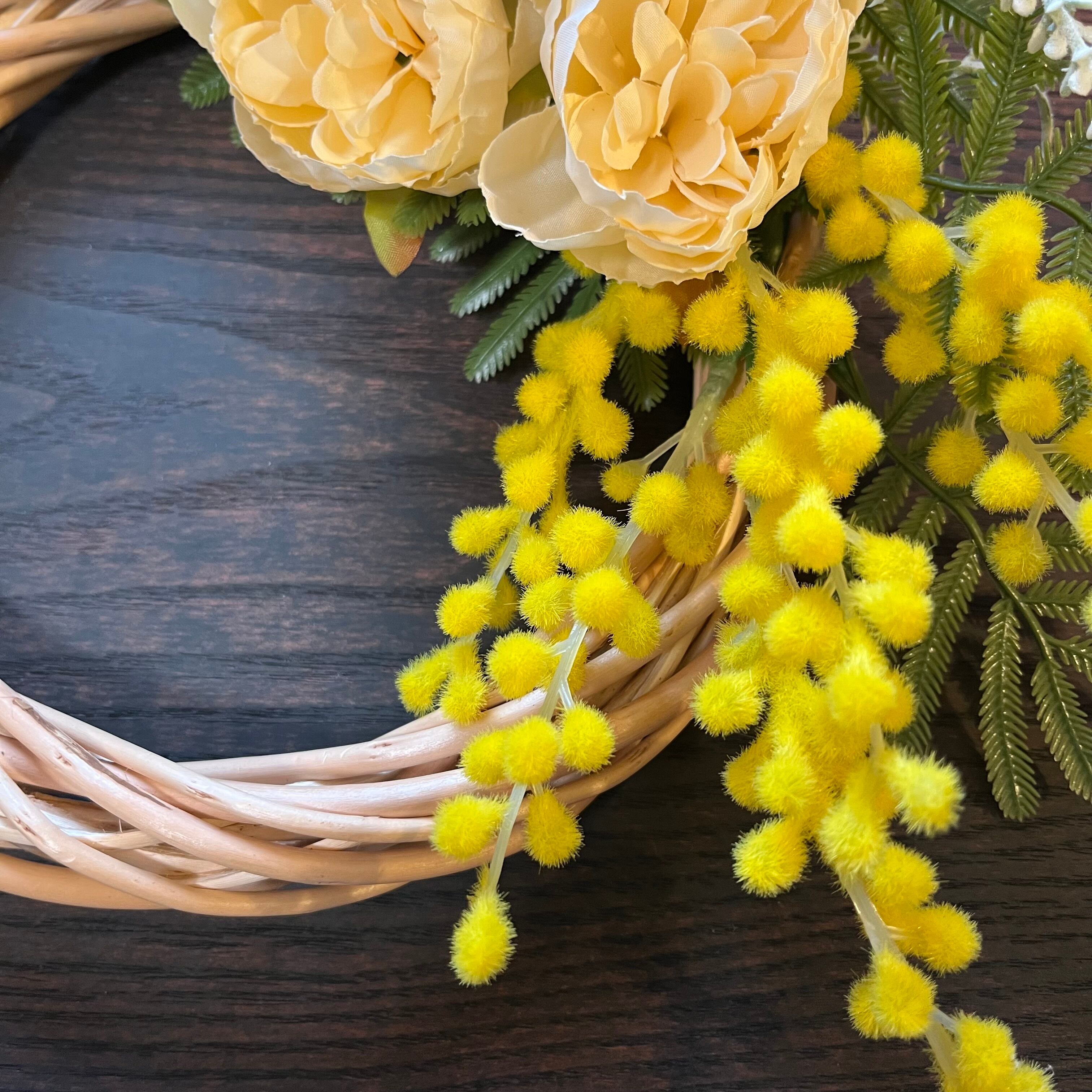 ミモザ、ピオニーなどのお花を散りばめた春らしいイエローと淡いペールオレンジの華やかなリースです。