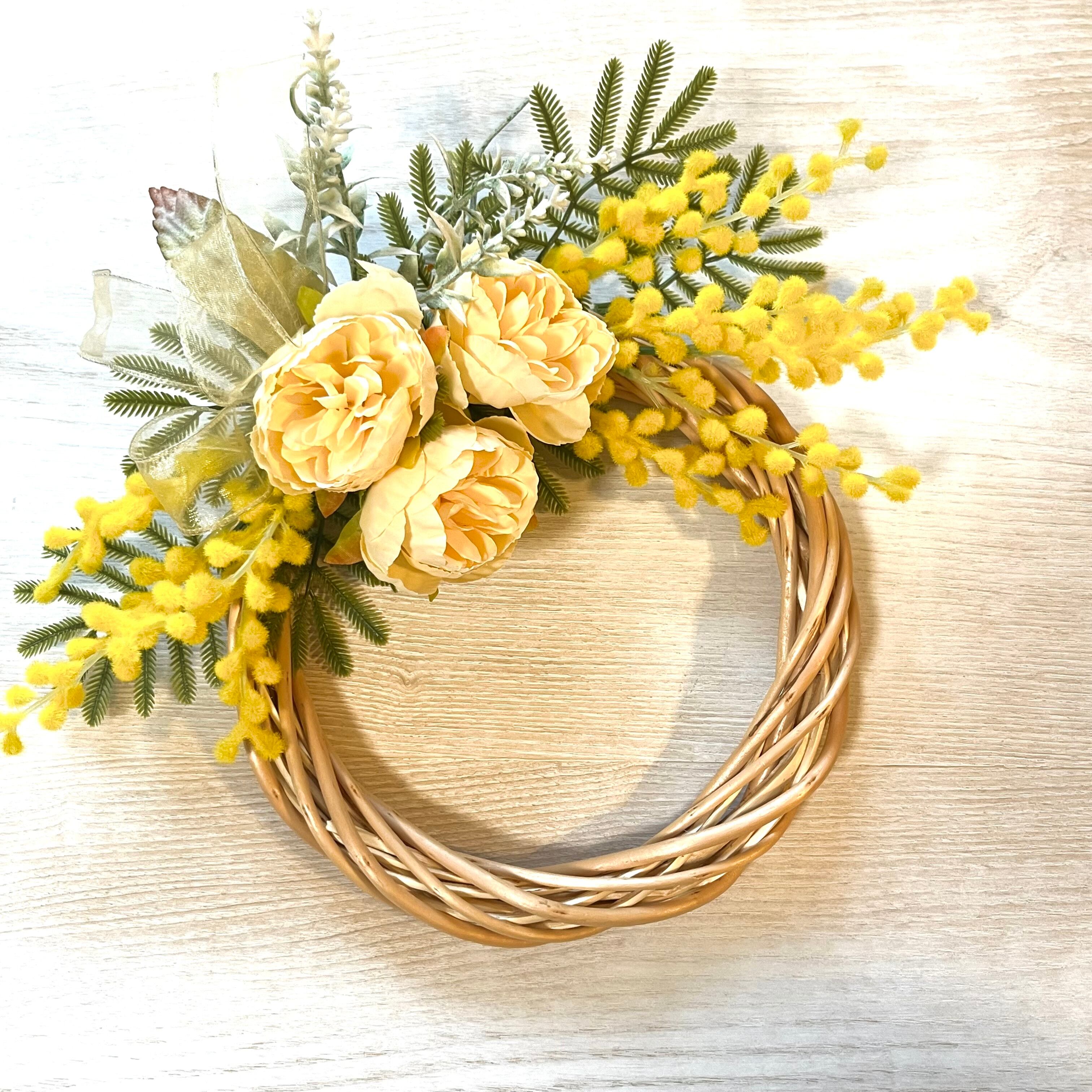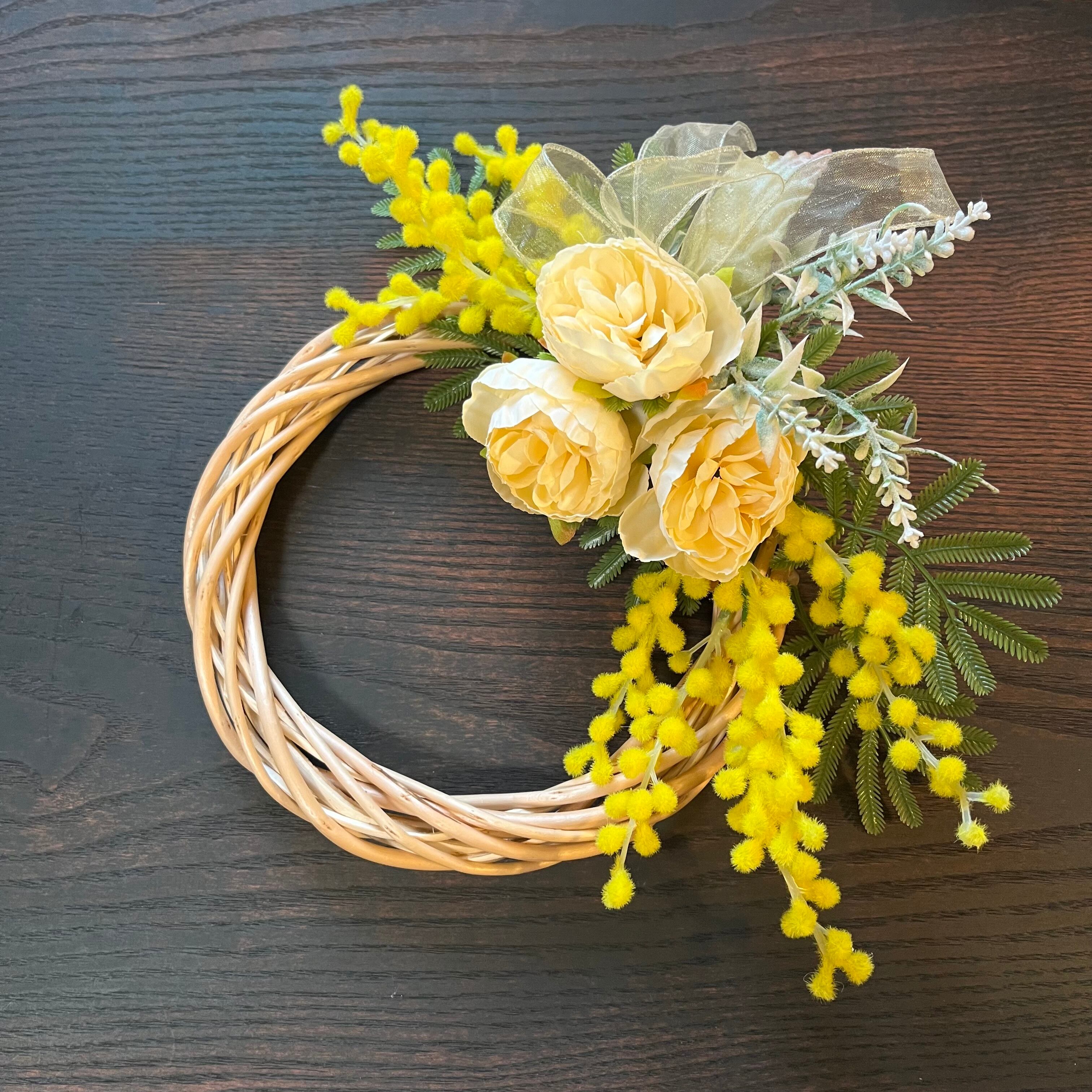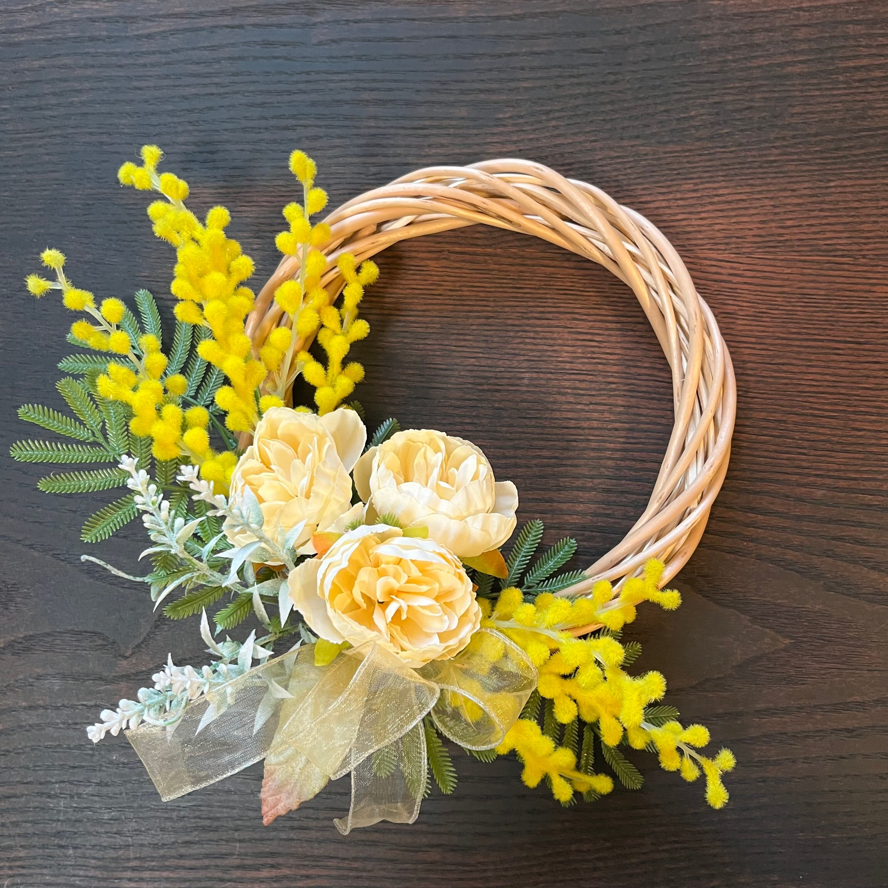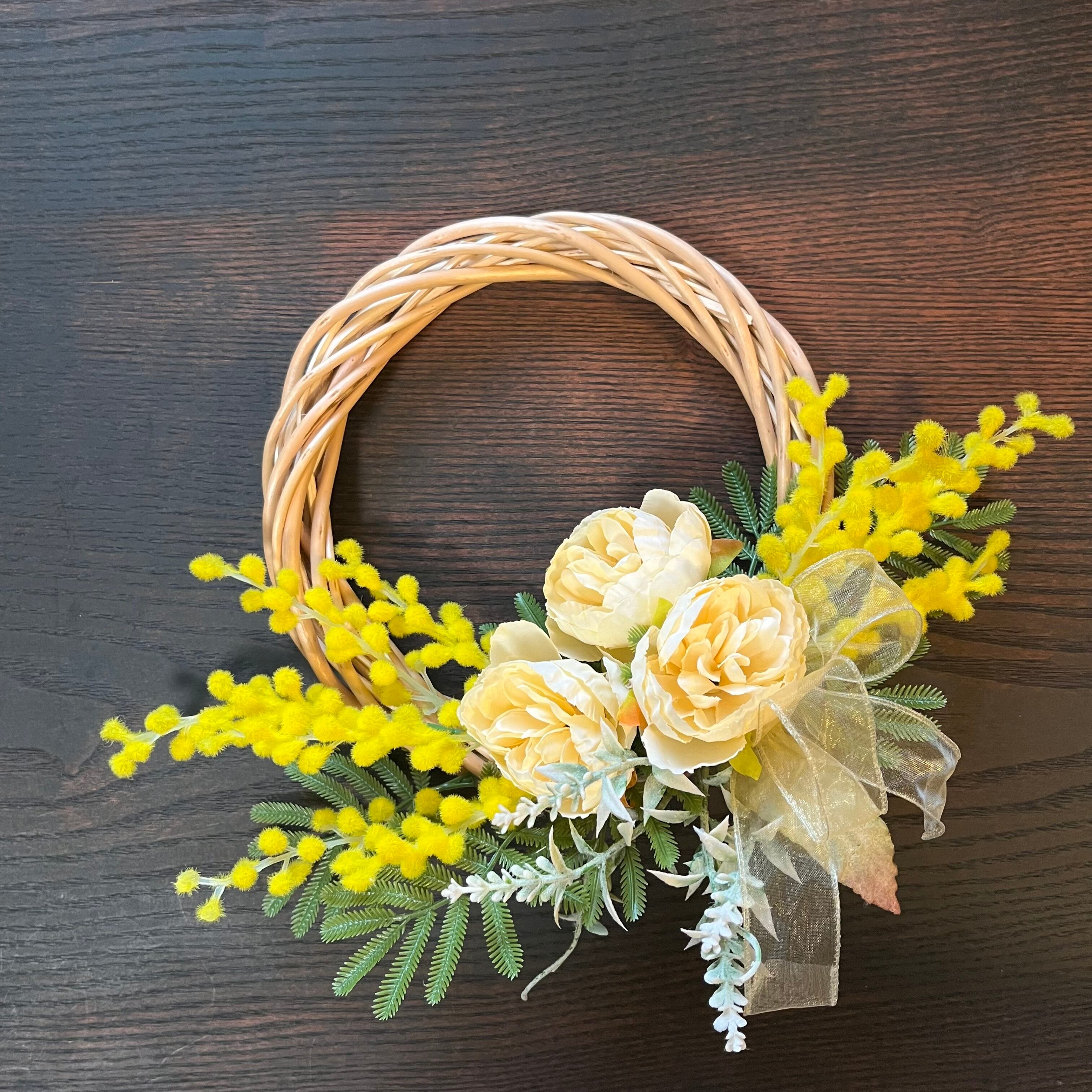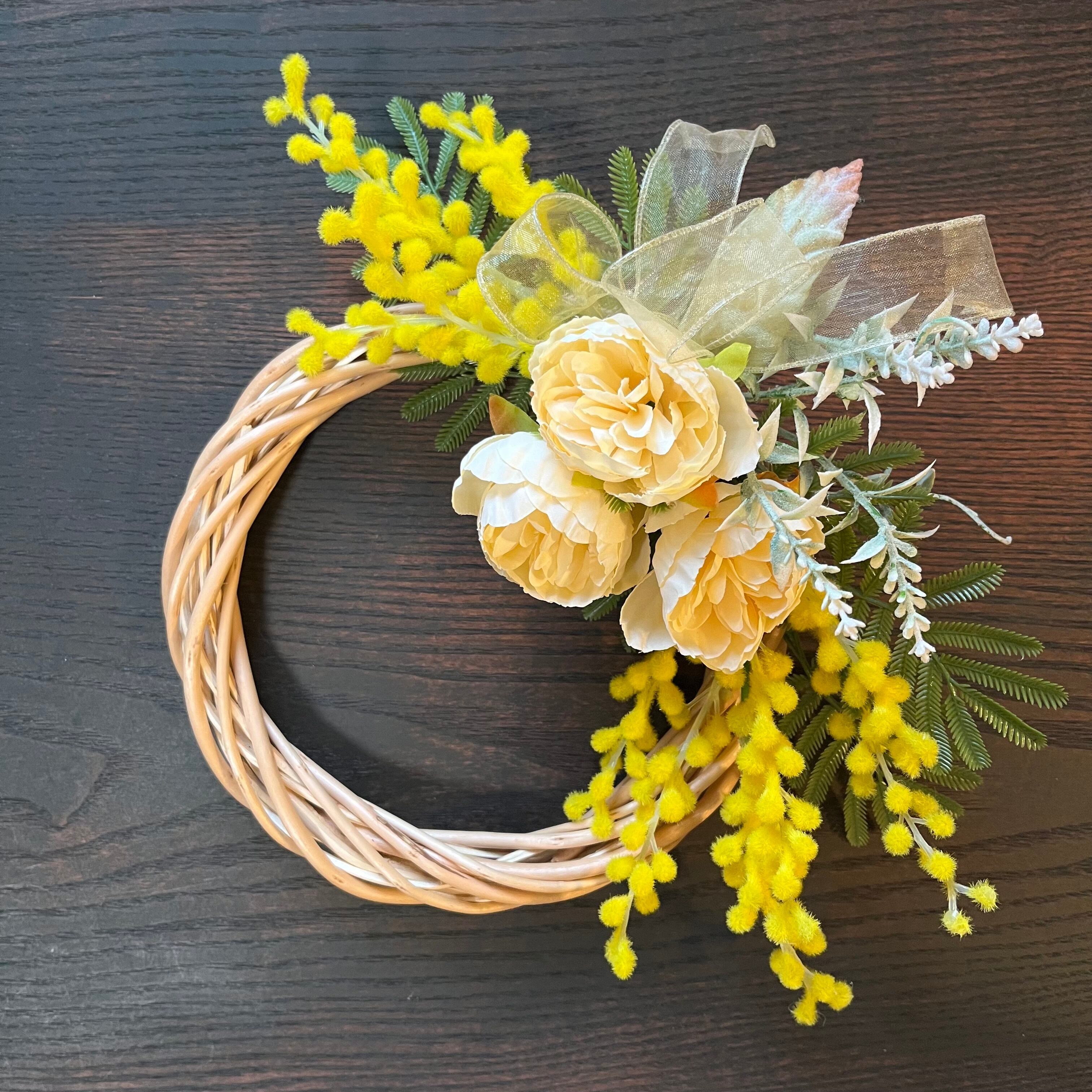 ミモザ、ピオニーなどのお花を散りばめた春らしいイエローと淡いペールオレンジの華やかなリースです。